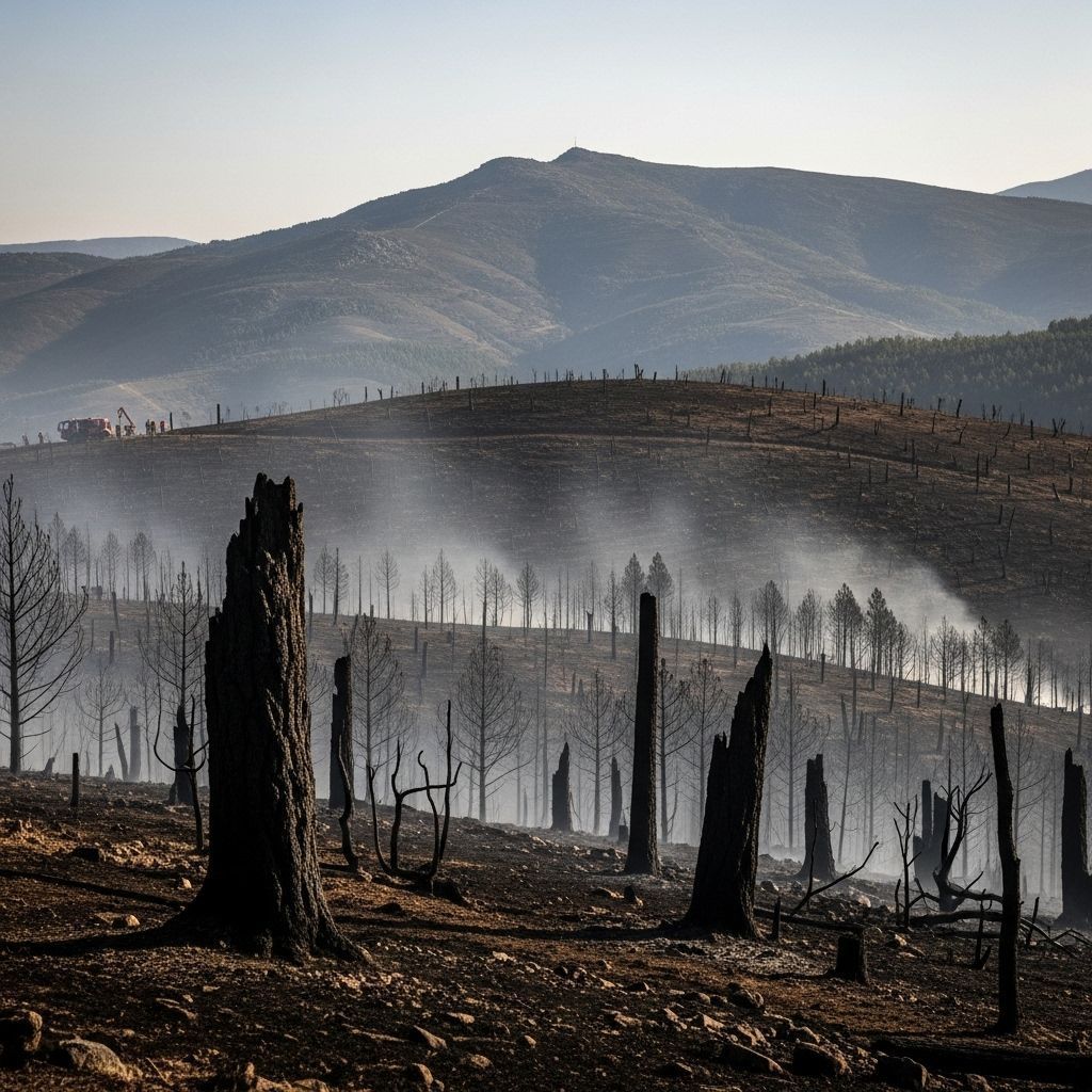 Portugal's northern and central regions bore the brunt, exposing persistent vulnerabilities: depopulation of rural areas leaves vast tracts unmanaged, eucalyptus and pine monocultures create continuous fuel beds, and fragmented land ownership (the minifúndio system) frustrates coordinated forest management. The decline of traditional shepherding, which historically kept undergrowth in check, compounds the combustible load.